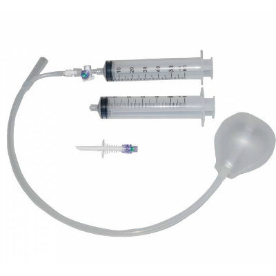 * trusă completă cu tub dublu lumen de 150 cm cu dispozitiv de perforare la vârf, robinet cu 3 căi și supapă precum și 2 seringi de 60 ml
