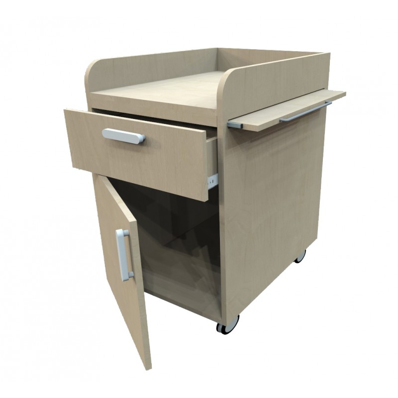 Masa de înfășat bebeluși confecționat din PAL melaminat compus dintr-un sertar pe șine silențioase și un dulăpior dedesubt cu poliță laterală culisantă pentru suport șervețele/scutece.
