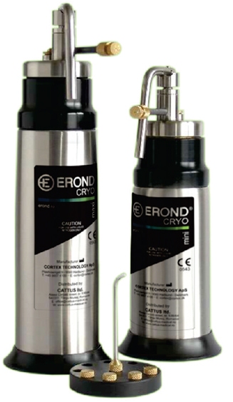 Unitatea de criochirurgie EROND CRYO asigură tratamentul prin contact direct sau pulverizare azot lichid la o temperatura de –196°C în condiții de maximă siguranță și comfort pentru pacient.